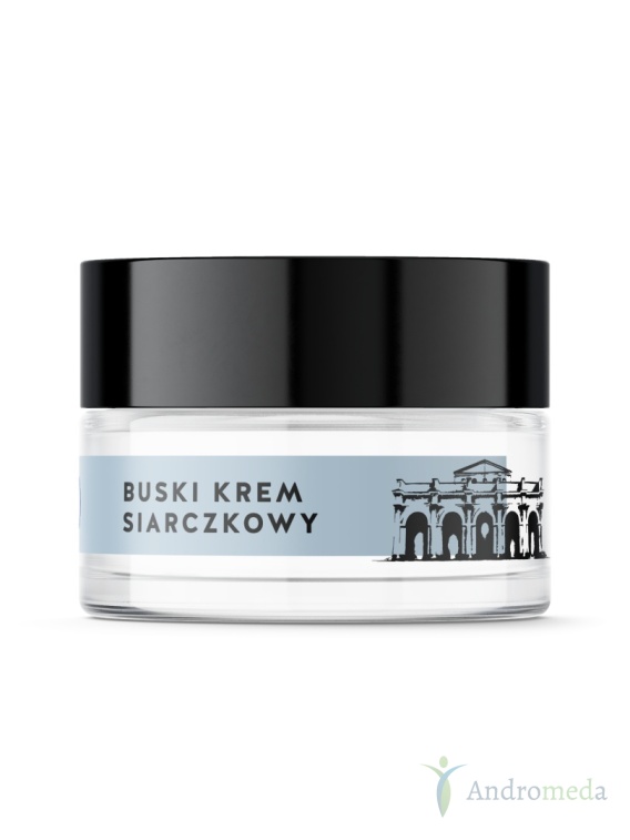 "Buski Krem Siarczkowy™ z Wit.A+E zawiera w swojej unikalnej recepturze połączenie wyjątkowej mocy pielęgnacyjnej krystaliczną wodą siarczkowo-siarkowodorową słoną prosto ze źródła "Zuzanna" Las Winiarski k. Buska-Zdroju z aloesem, olejkiem jojoba, wiesiołkowym, różanym i lawendowym oraz z witaminami A+E i gliceryną. Buska woda siarczkowa ze źródła „Zuzanna" jest wysoko zmineralizowaną Ieczniczą wodą naturalną o bardzo dużej aktywności biologicznej dwudziestu biopiewiastków i związków siarki dwuwartościowej, czyli siarczków, wodoro-siarczków i wielosiarczków. Biosiarka, szczególnie w postaci zdysocjowanej jest niezbędnym biopierwiastkiem do prawidłowego funkcjonowania niemal każdej ludzkiej komórki, a nasza skóra szczególnie potrafi z niej korzystać. Siarczki działają na naszą skórę keratolitycznie, czyli rozluźniają spoiwa pomiędzy komórkami warstwy naskórka i w ten sposób bardzo delikatnie, ale skutecznie, usuwają martwy naskórek, pobudzają mikrokrążenie i poprawiają wygląd skóry.